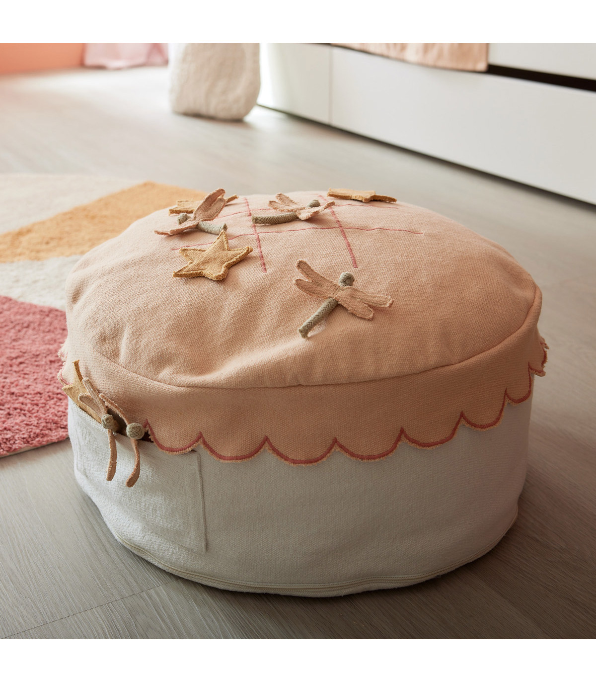 Il design incantevole con stelle e libellule lo rende un vero e proprio punto focale in ogni cameretta. Il cuscino è dotato di una pratica tasca laterale, dove le pedine possono essere riposte in sicurezza quando il pouf viene utilizzato come seduta. In collaborazione con la rinomata designer Lorena Canals, conosciuta per i suoi prodotti ecologici e artigianali, questo pouf garantisce la massima qualità e sostenibilità.