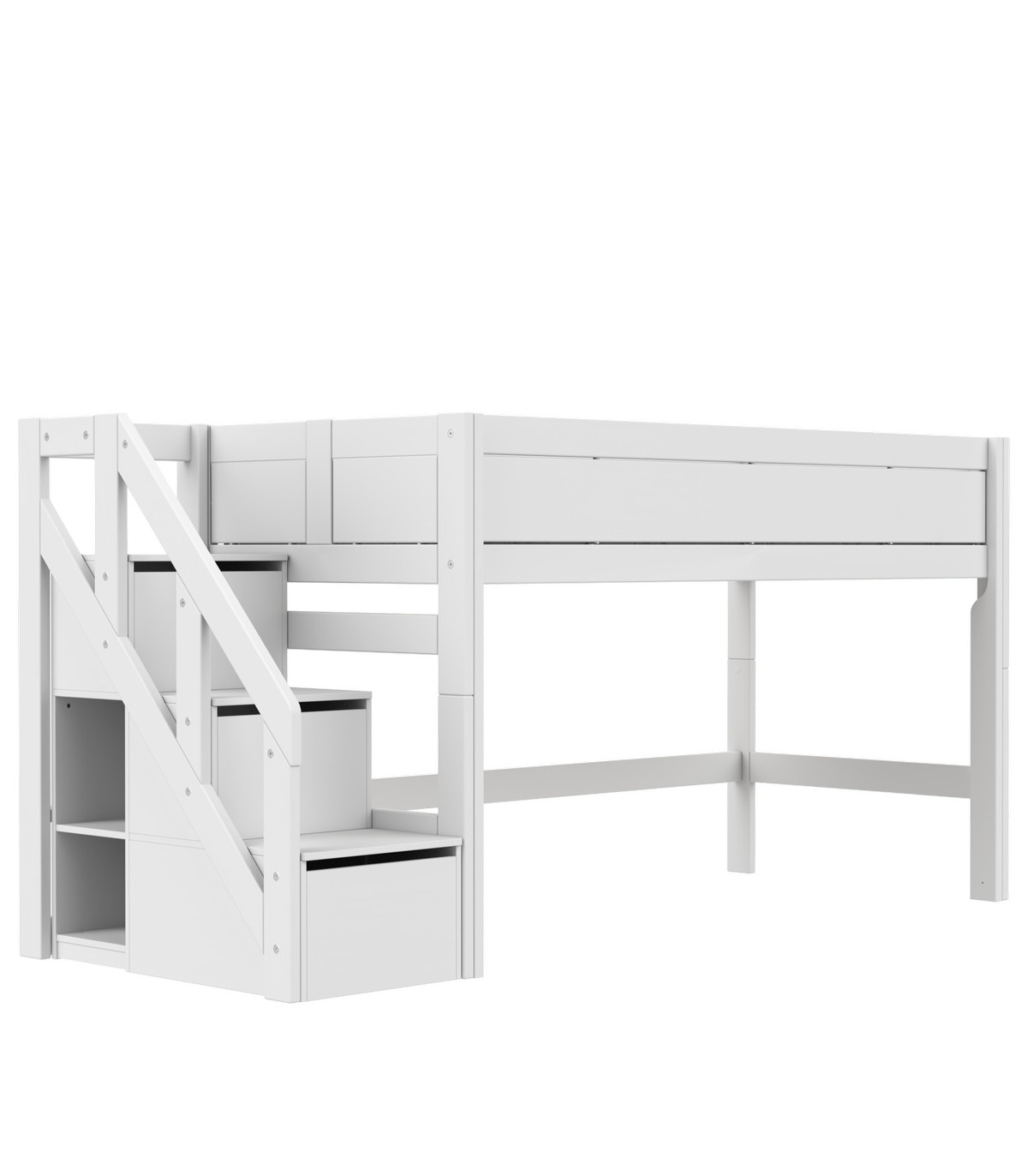 Scopri il nostro letto a soppalco versatile con scaletta laterale, che si adatta idealmente alle esigenze del tuo bambino! Questo letto innovativo combina una salita sicura e facile con un intelligente spazio di archiviazione e offre allo stesso tempo una meravigliosa area giochi sotto il letto.