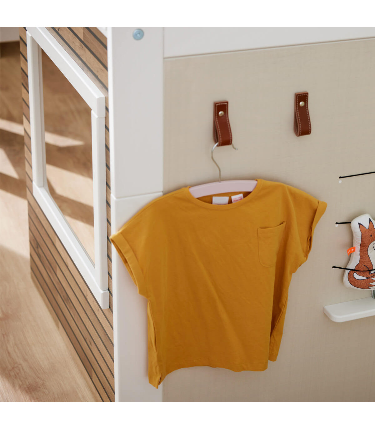Il pannello laterale stampato nei toni della terra ha caratteristiche intelligenti come le maniglie in pelle per appendere vestiti o accessori e un ripiano con cinghie elastiche per riporre libri o altri oggetti.