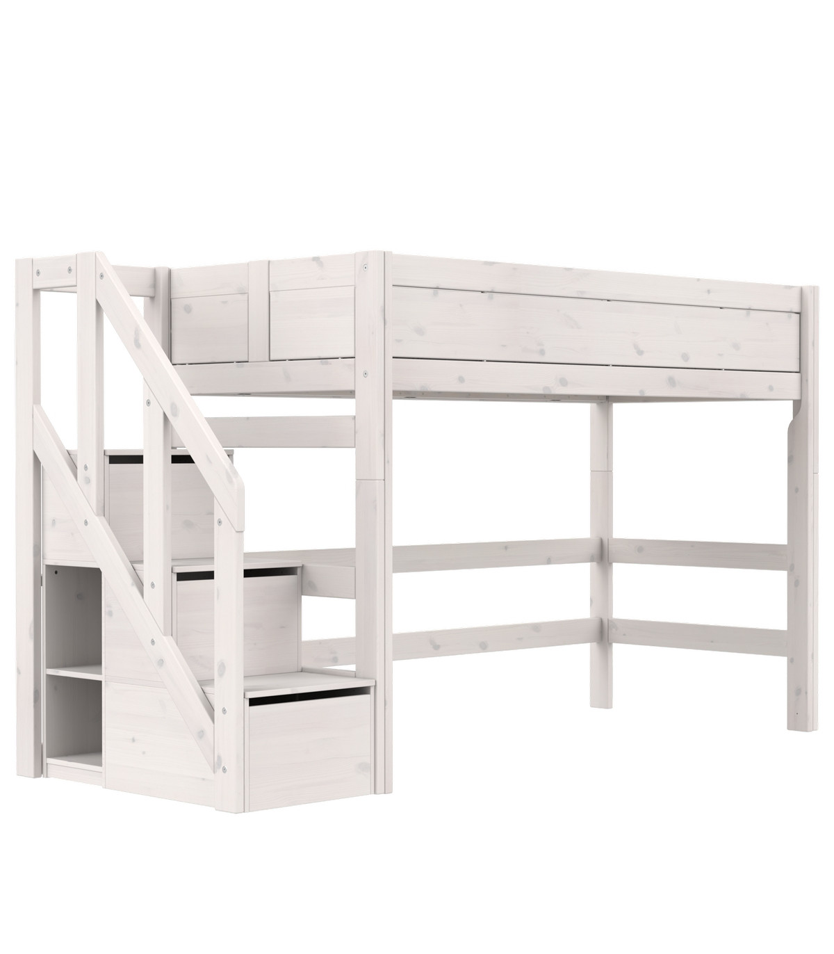 Un letto a soppalco medio è leggermente più alto del letto a mezza altezza, ma comunque ad un'altezza facile da raggiungere, anche per la biancheria da letto. Le scale laterali possono essere montate a sinistra oa destra e, oltre a un posto per salire, offrono anche molto spazio di archiviazione.