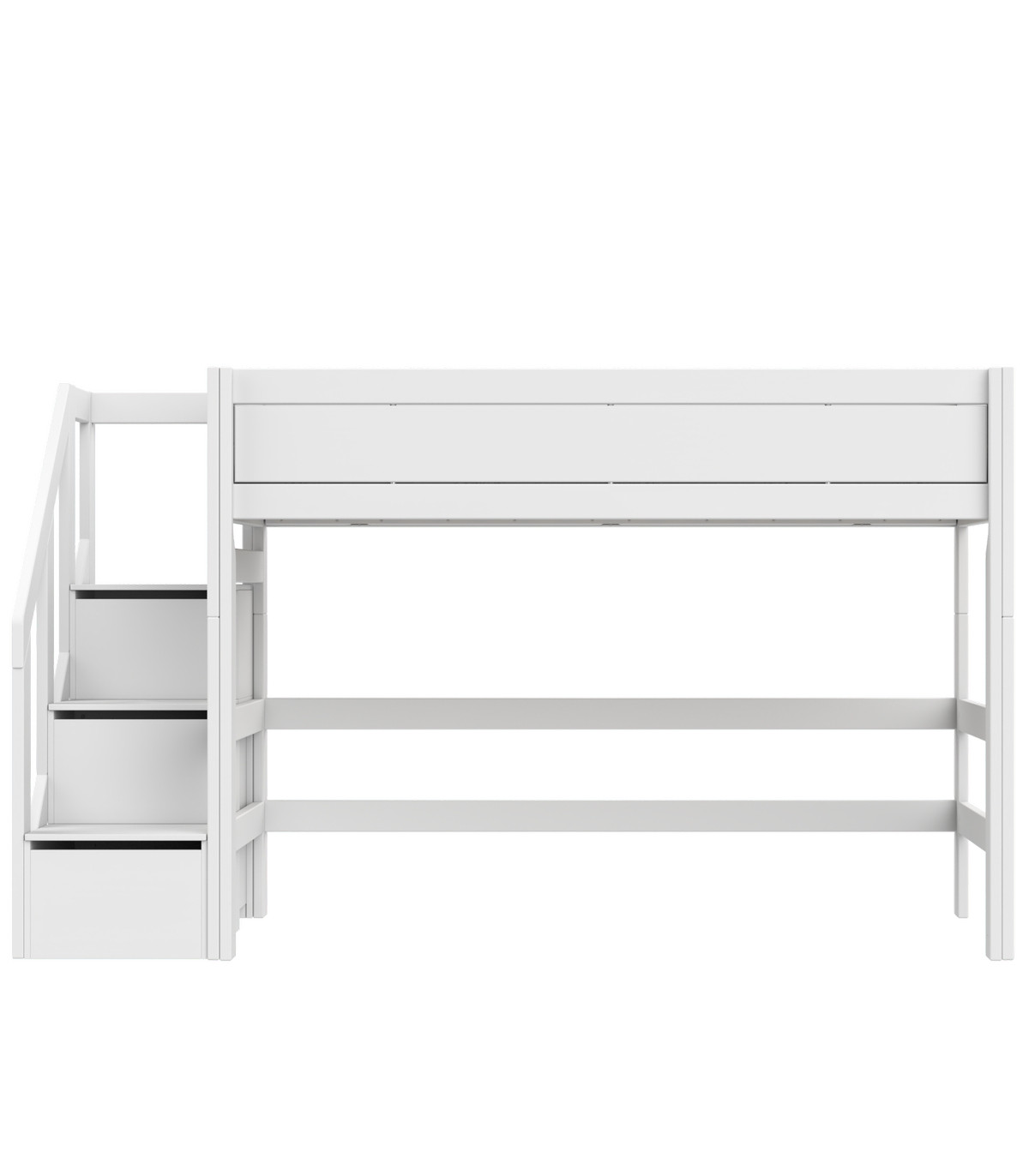 Un letto a soppalco medio è leggermente più alto del letto a mezza altezza, ma comunque ad un'altezza facile da raggiungere, anche per la biancheria da letto. Le scale laterali possono essere montate a sinistra oa destra e, oltre a un posto per salire, offrono anche molto spazio di archiviazione.