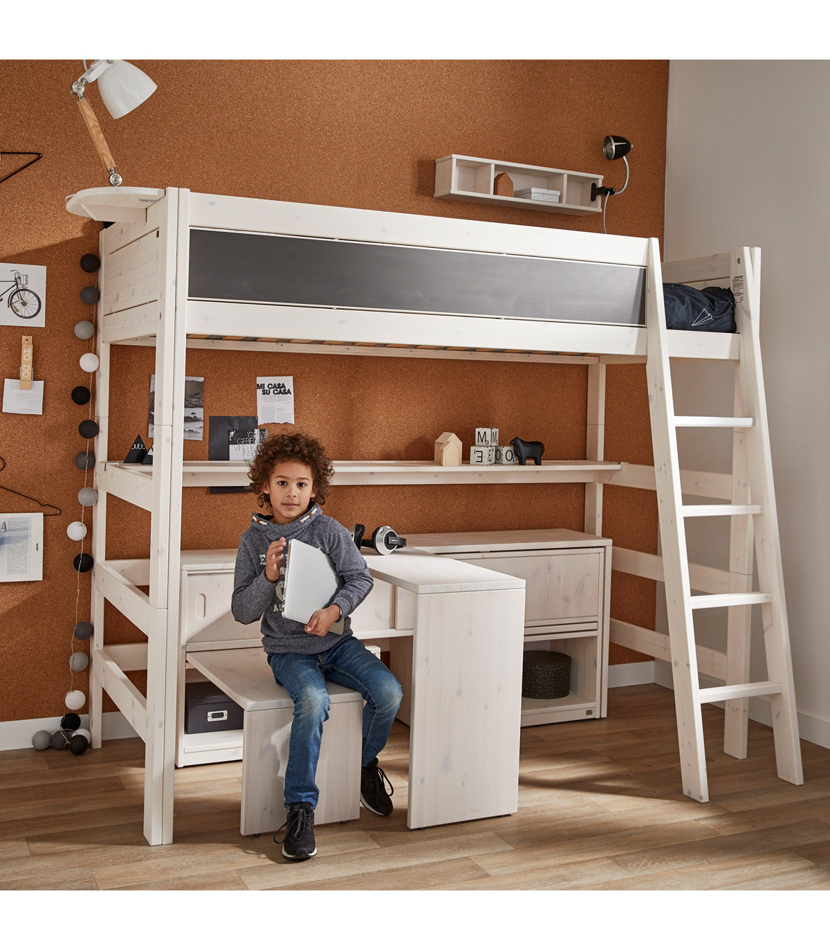 Il letto a soppalco viene spesso utilizzato in stanze più piccole, dove sotto il letto si cercano soluzioni ottimali per integrare diverse funzioni, come una scrivania, una piastra di scrittura continua, posti a sedere, ecc. La scala inclinata offre a un bambino leggermente più piccolo più sicurezza per raggiungere il letto. Gli ausili per l'arrampicata Art. 991 1 sono adatti anche per la scala se il bambino ha bisogno di ulteriori opzioni di presa qui.