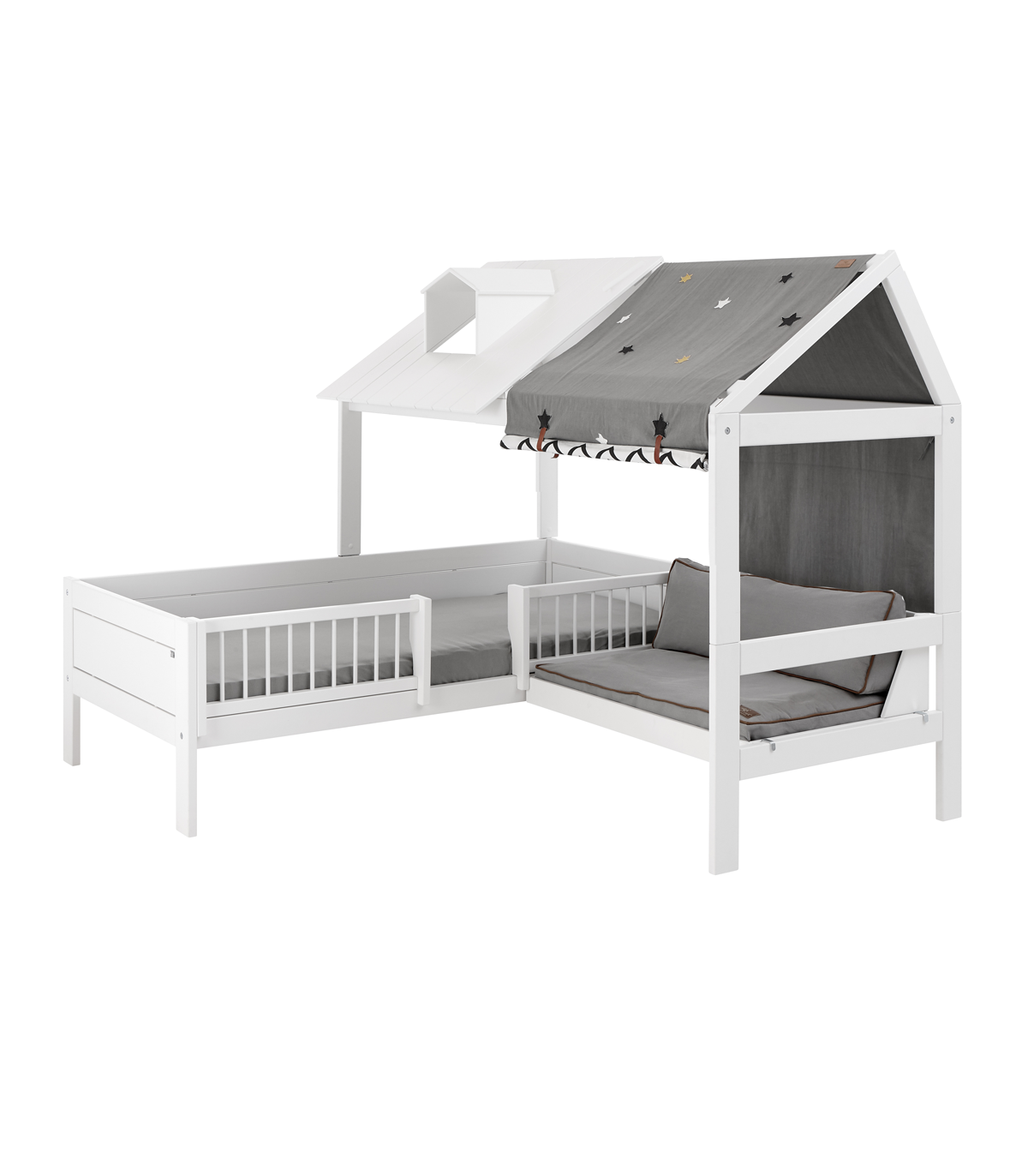 Una culla super cool casa sulla spiaggia. Sul lato abbiamo appeso un divano fresco e messo il tetto su di esso. La panca viene fornita con i cuscini (seduta e schienale). Per il tetto, hai diverse opzioni: standard è un tetto semichiuso dove puoi tenerlo, o il tessuto fresco della tenda (Art. 7470) sopra il divano o un tetto in legno extra (Art. 6378).