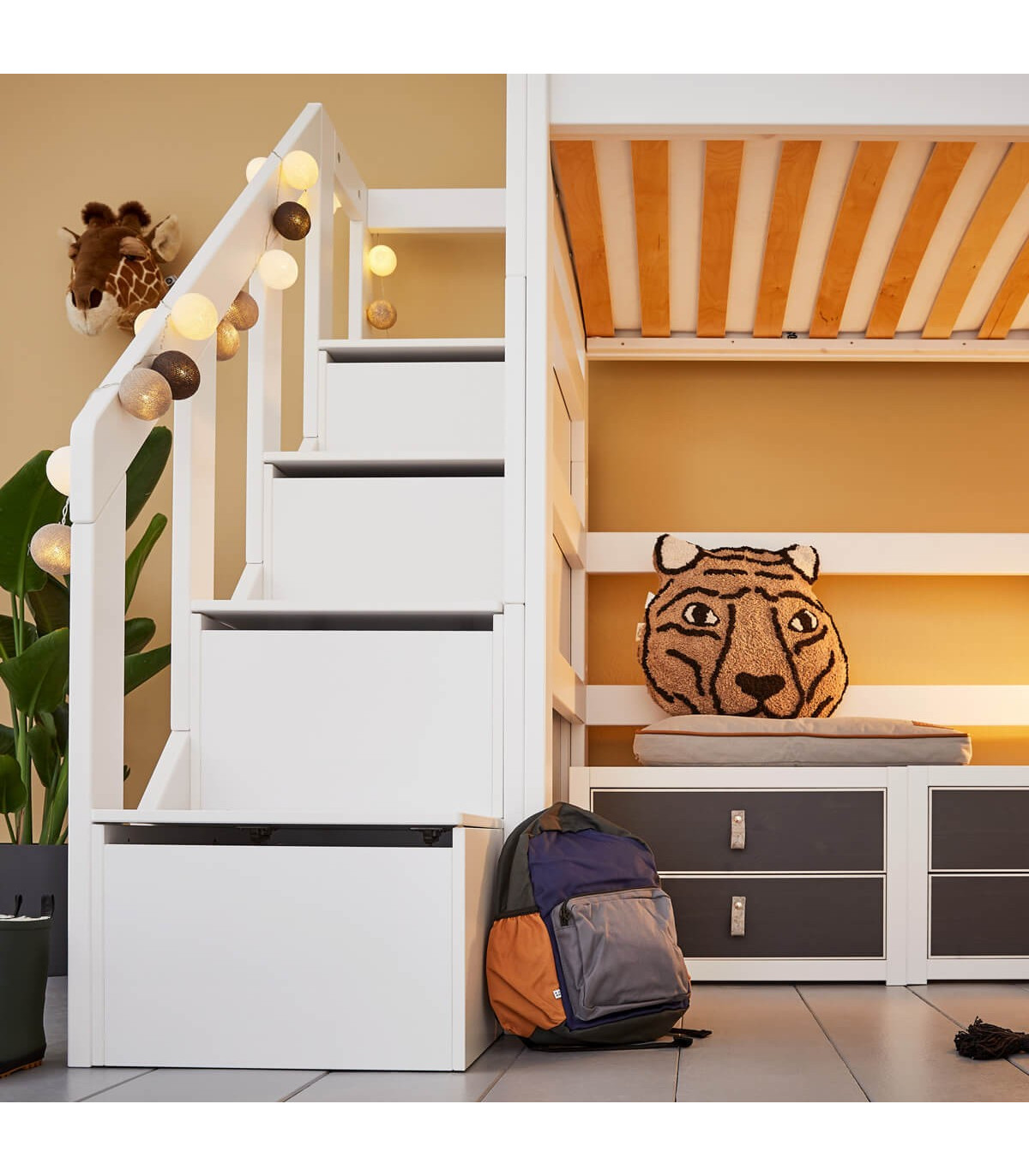 Un letto a soppalco offre lo spazio più ampio possibile sotto un letto. Qui, un grande piatto di scrittura, un letto soggetto a posizione trasversale può anche trovare un posto. Le scale laterali possono essere montate a sinistra oa destra e, oltre a un posto per salire, offrono anche molto spazio di archiviazione.