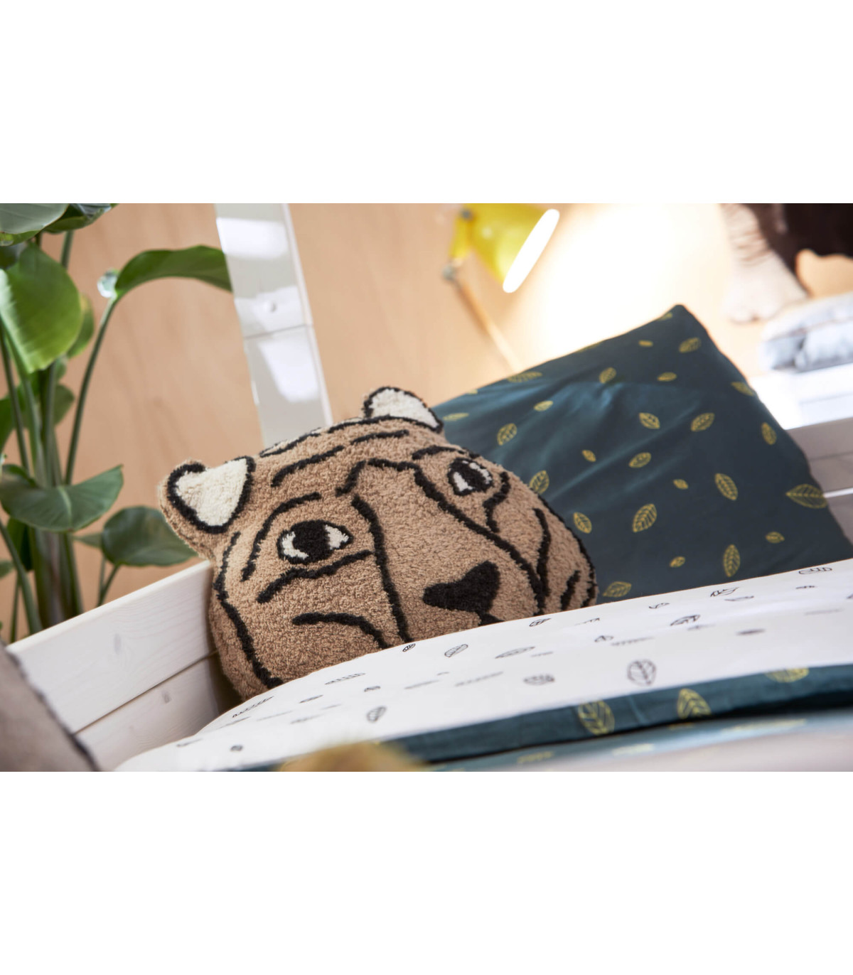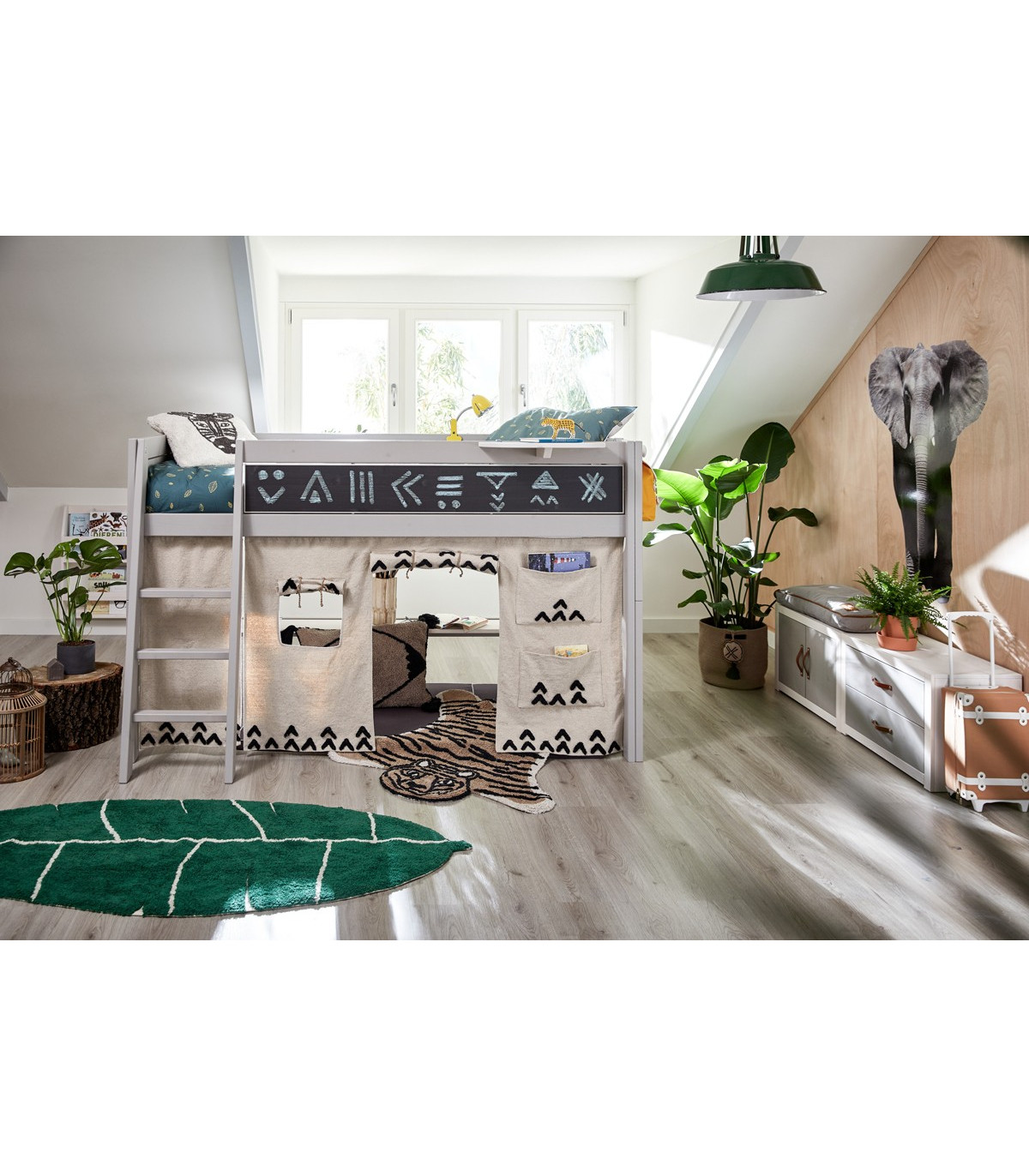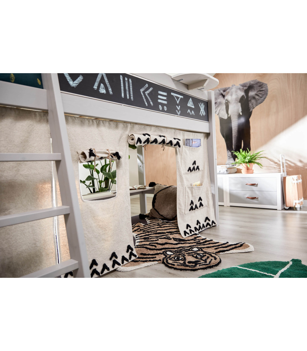 Con questa altezza, il letto a mezza altezza offre molte funzionalità e spazio per molte altre applicazioni. Sotto il letto, è possibile integrare divertenti tende da gioco e materassi da gioco per esigenze e gusti diversi. Naturalmente, la variante con la scala diritta occupa meno spazio rispetto alla variante con la scala inclinata. Sul letto puoi anche posizionare un tetto del modello Hideout, se vuoi trasformare il letto in una capanna.