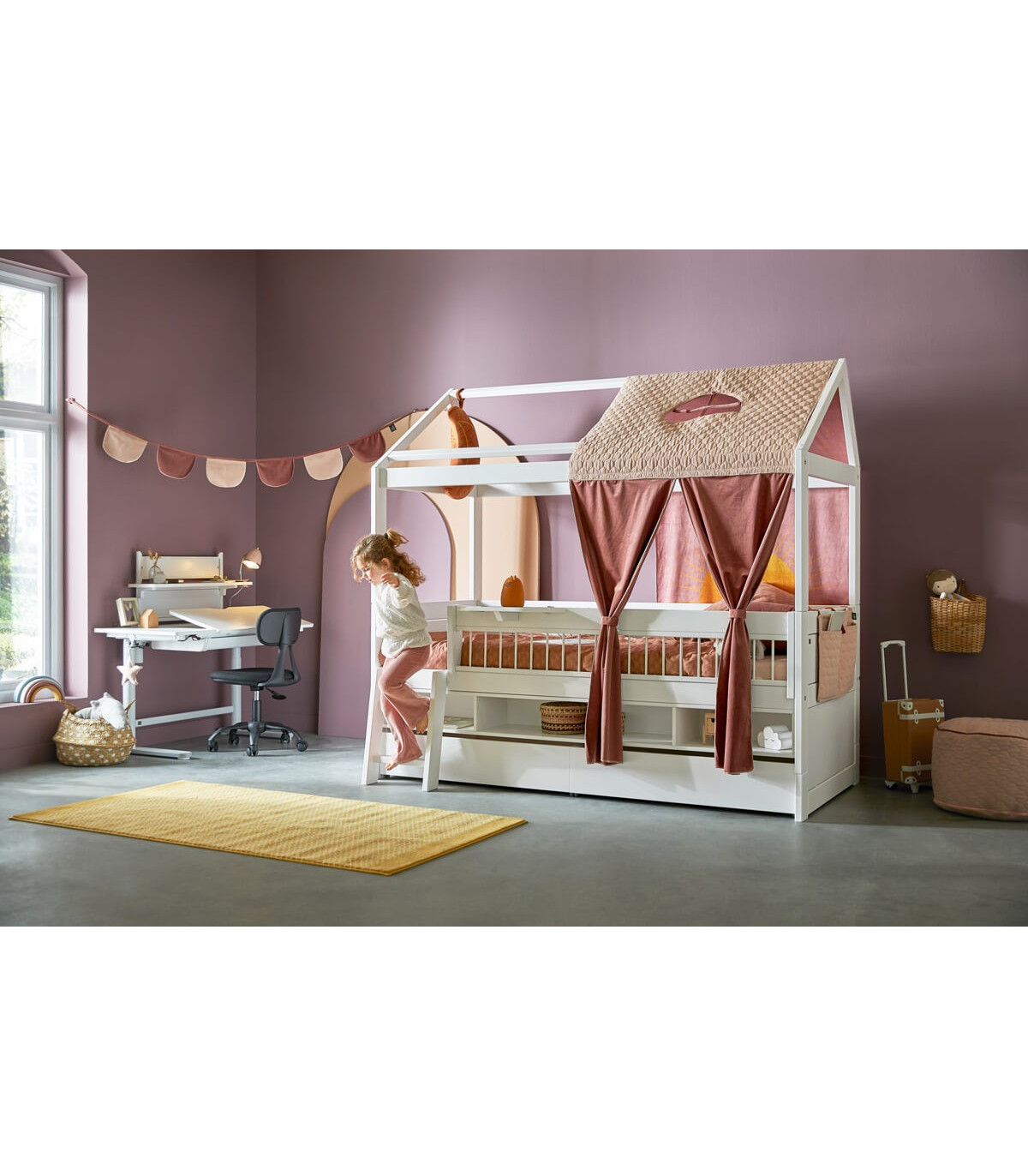Il letto a castello è l'ideale se si desidera avere ulteriori opzioni per lo spazio di archiviazione o soluzioni di letto per gli ospiti a bassa altezza di sonno. Nell'area sotto il letto c'è spazio sufficiente per posizionare 3 ripiani art. 8005, che possono essere dotati di porte o pulsanti o per la soluzione letto per gli ospiti con scatola da letto art. 7040 + 7042. Un'altra opzione è quella di posizionare la tavola da corsa e scivolare con protezione anticaduta in mezzo. Art. 174 + 172 + 4621. Se vuoi un tetto o un cielo sopra il letto, questo è possibile anche qui.