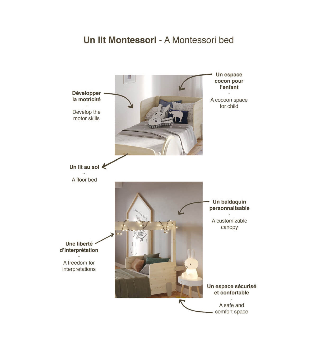 Nell'idea di una pedagogia attiva, incentrata sulla pedagogia montessoriana, il bambino scopre da solo il suo ambiente, la sua stanza, e può lasciare il suo letto a suo piacimento o andarci quando si sente stanco. Il letto Discovery è accessibile fin dalla più tenera età.