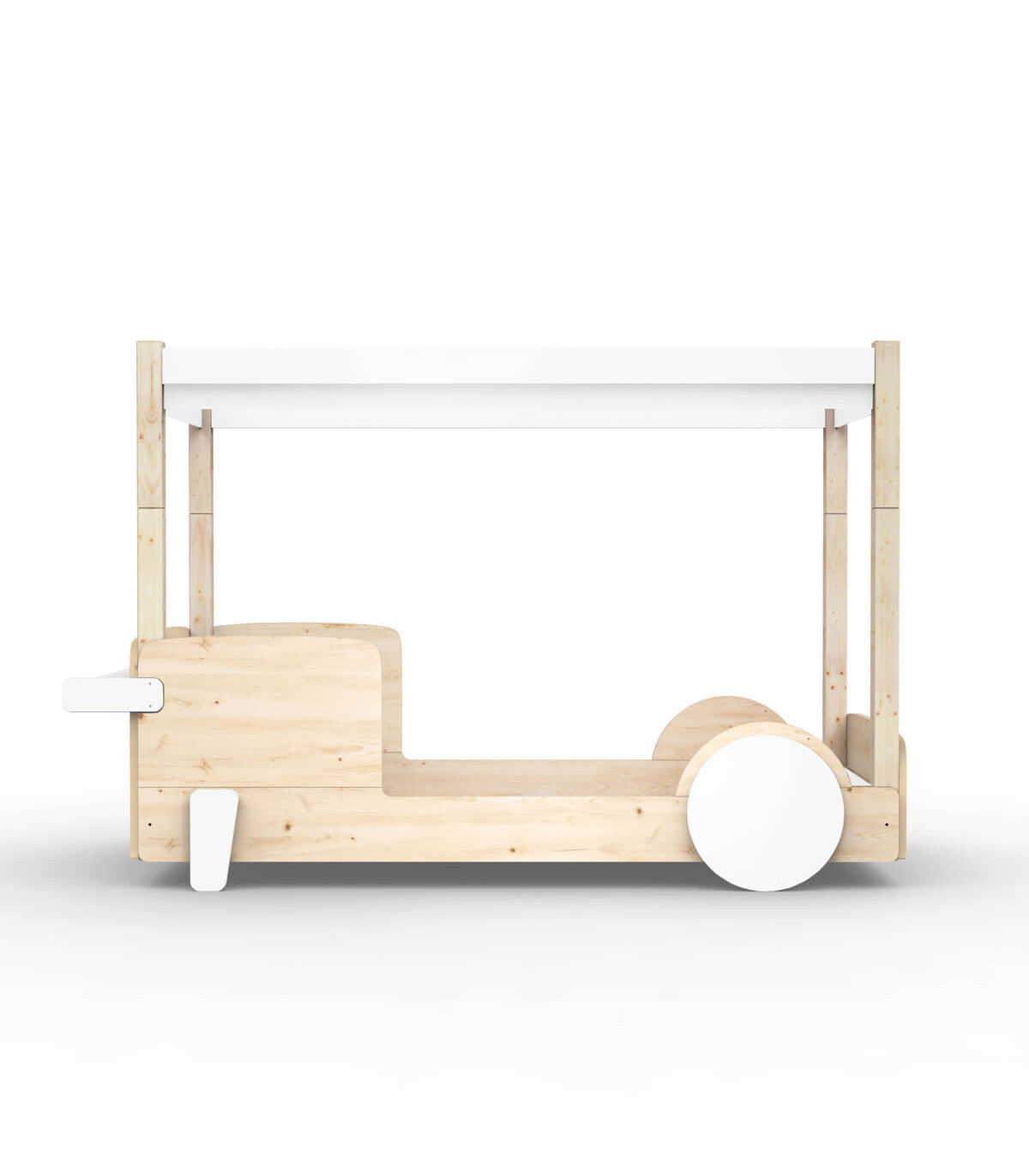 Il letto Discovery si evolve e accompagna la crescita del bambino. Dal letto trasformabile ai letti a castello e al baldacchino, Discovery è un letto in continua evoluzione che si adatta alle esigenze del bambino e dei genitori. Inoltre, può essere sollevato a un'altezza più tradizionale e ospitare un cassetto del letto. Questo modello originale permette al bambino di scoprire il mondo creando il proprio. Gli elementi del disegno suggeriscono il movimento, ma sono liberi di essere interpretati. Il letto Discovery può essere associato a un mezzo di locomozione e alla bancarella del venditore ambulante o del gelataio. Tutti i sogni sono ammessi...