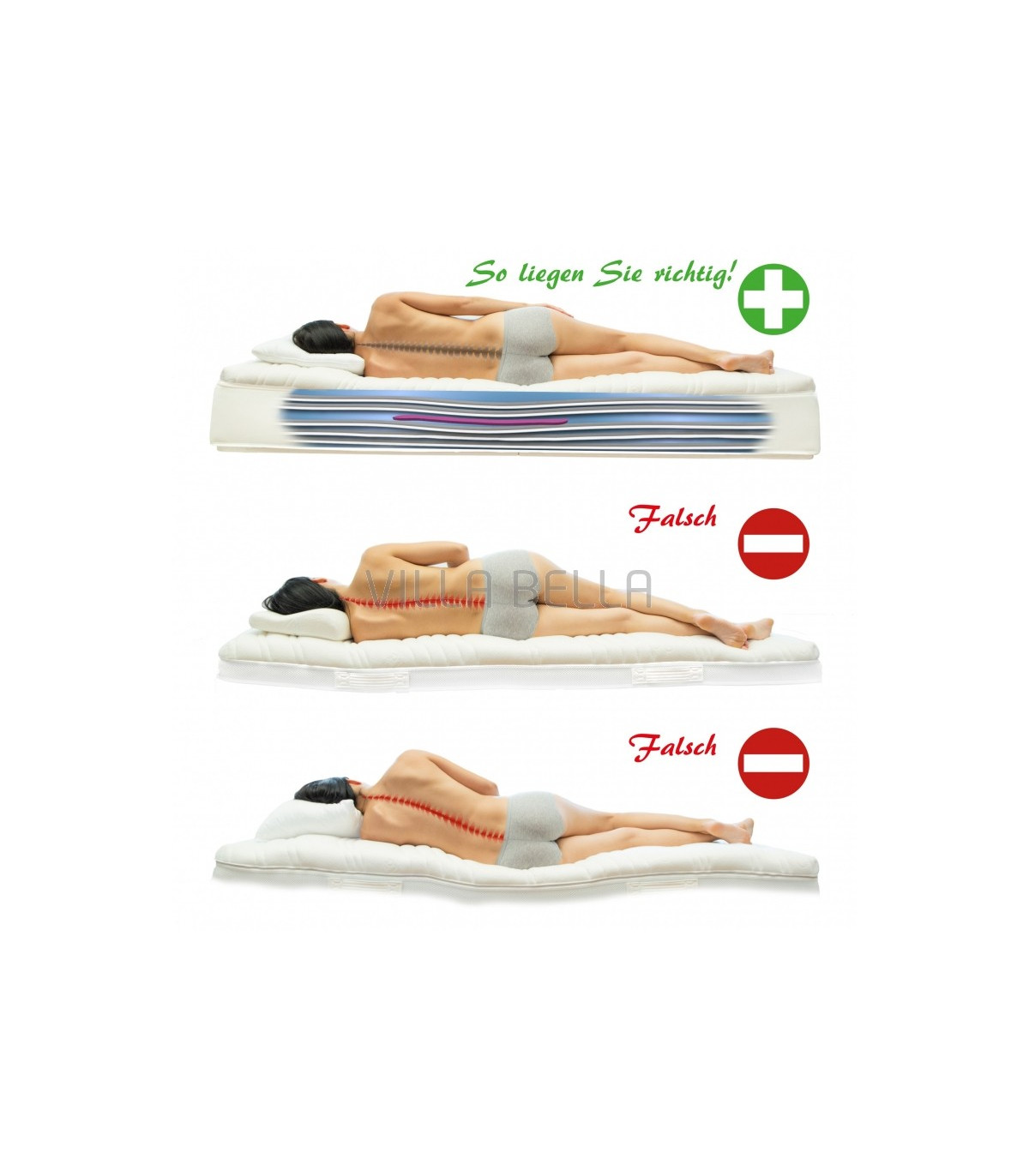 Nucleo di costruzione a sandwich con speciale tecnologia di taglio a cubo, che ha condotti dell'aria longitudinali e trasversali. Lo strato superiore e inferiore Visco è sensibile, flessibile ed elasticamente diviso in zone del corpo orientate verso le aree sdraiate. Lo strato interno è di supporto, oltre che permanentemente portante. La circolazione dell'aria è assicurata dalla ventilazione dei tagli verticali e dal nucleo profilato trasversalmente, dalla struttura biocellulare della soia a poro aperto e dall'inserto AIRTEX. Inserto anatomico posteriore 3D nella zona pelvica: – flessibile – traspirante – morbido – fedele alla forma.